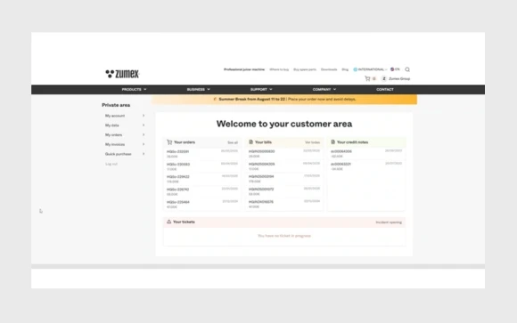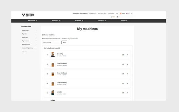 Descubre el Área Personal de Zumex: gestiona tus pedidos y facturas, repite compras, registra tus máquinas y encuentra repuestos por número de serie. Todo 100% en línea y de forma autónoma.
