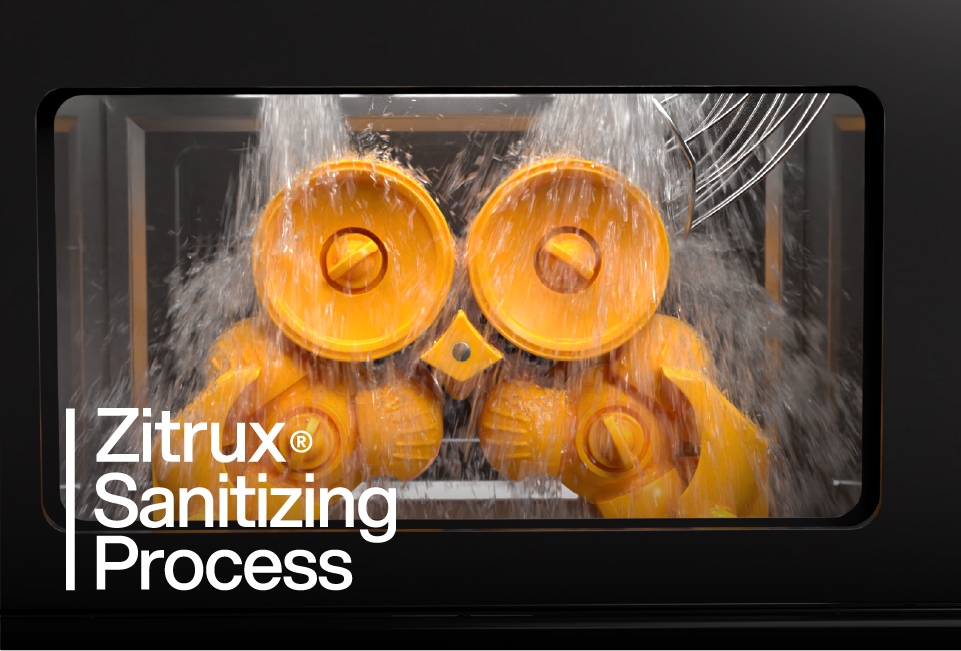 The first automatic self-cleaning system for juicers: a patented technology that combines water, detergent, heat, and recirculation to sanitize the entire circuit, including the tap.
